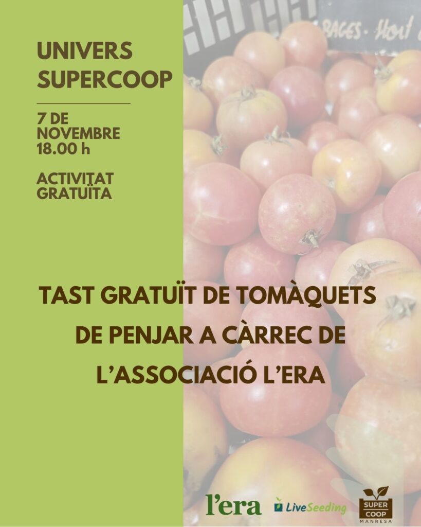 L’Univers Supercoop de novembre arriba divendres de la setmana vinent amb una sessió de tast de tomàquets de penjar de l’associació L’Era. L’activitat ja suma les primeres inscripcions. Des de Supercoop Manresa et proposem que vinguis a fer un tast de diverses varietats de tomàquet de penjar del projecte Livesseding sobre recuperació i difusió de llavors ecològiques de varietats locals.