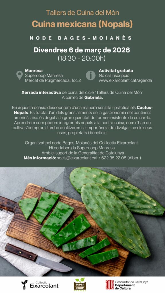 A través de l’activitat descobrirem d’una manera senzilla i pràctica com aprofitar a la cuina els Cactus-Nopals. És un dels grans aliments de la gastronomia del continent americà i aprendrem com podem integrar els nopals a la nostra cuina, com s’han de cuinar i cultivar i divulgarem els seus usos, propietats i beneficis.