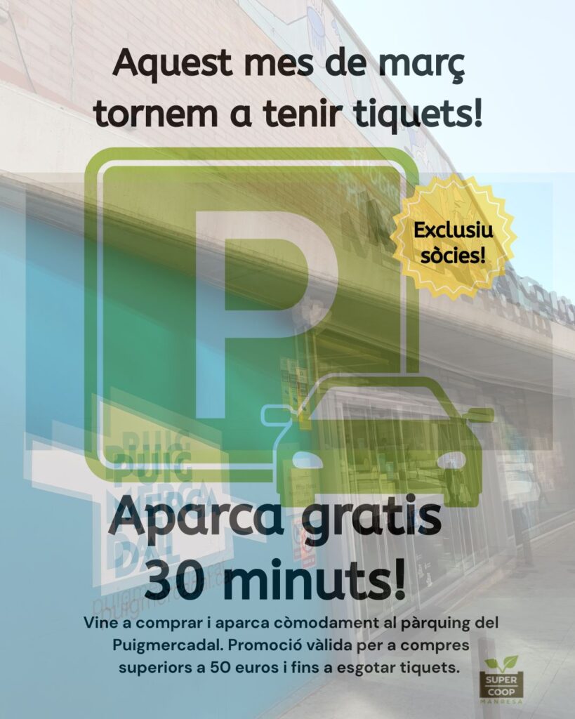 Després que durant el mes de febrer no disposéssim dels tiquets d’aparcament gratuït aquest març ja els tenim a botiga altra vegada. Des del Mercat Puigmercadal ens han servit nous tiquets que deixem a la vostra disposició. Us recordem que us permetran aparcar 30 minuts gratuïtament a l’aparcament del mercat sempre que feu una compra superior a 50 euros a Supercoop. Així que ja ho sabeu, demaneu-los a caixa, aprofiteu aquest avantatge exclusiu que posem a la vostra disposició com a sòcies i no espereu massa dies a venir que s’acaben ràpid